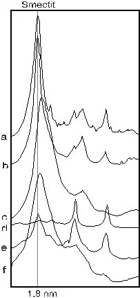 Röntgendiffraktogramme von Ton-Teilfraktionen belegt mit Mg und Glycerin, Sm = Smectit, Ve = Vermiculit, Il = lllit, Ka = Kaolinit a-c, 70-90 cm, Basislage. a: 0,2-2 µm, b: 0,06-0,2 µm, c: <0.06 µm d-f, 0-25 cm, lößreiche Hauptlage. d: 0,2-2 µm, e: 0,06-0,2 µm, f: <0.06 µm