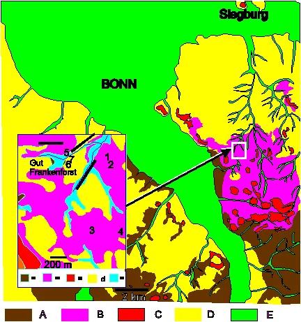 Geologie (nach Meyer 1989) und dominante Substrate (nach Schegiewal 1976, verändert). A = Gesteine des Unterdevon (Schiefergebirge), B = Tephra-Saprolith, C = feste Vulkanite, D und d = Löß (auf Mittel- und Hauptterrassen), E = Auenlehm (auf Niederterrassen und in rezenten Tälern); a = Gesteine des Unterdevon, b = Tephra-Saprolith, c = Basalt, d = Löß, e = Talfüllungen; 1 bis 7 Bodenprofile.