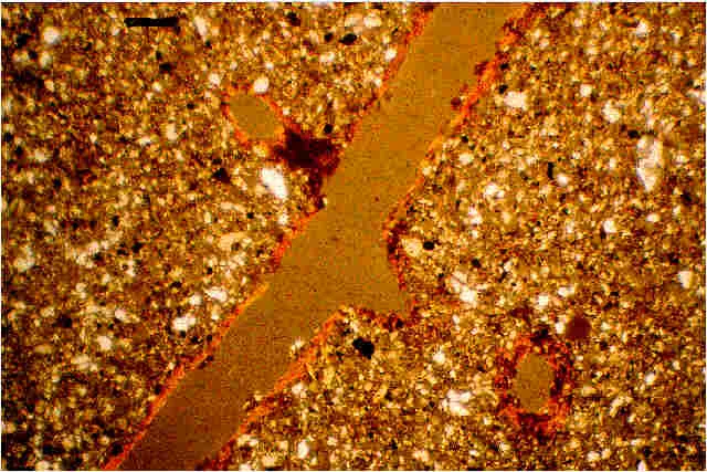 Foto 7: Profil 6, Parabraunerde-Braunerde aus Löß, 65 cm, Btv2-Horizont, Schliff 8071. Fließtonbeläge an Grobporenwänden. Dünnschliff zwischen txP, Bildhöhe 2,4 mm.
