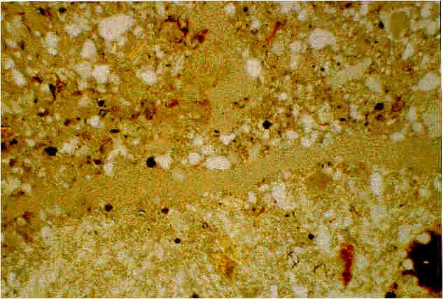 Foto 11: Profil 4, Pseudogley-Pelosol aus Hauptlage über heterogener Basislage, SwAp-Hohzont, Schliff 8852. Material fleckweise von Löß (im Bild oben) und von Tephrasaprolith (unten) dominiert. Dünnschliff zwischen txP, Bildhöhe 1 mm.