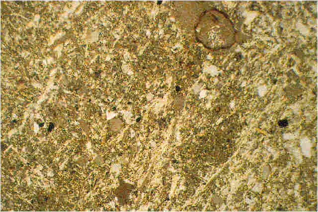 Foto 12: Profil 4, llSd-P2, Schliff 8855. Weitgehend plasmatisierter Tephrasaprolith mit Streßkutanen und Wurzelrest. Dünnschliff zwischen txP, Bildhöhe 1 mm.